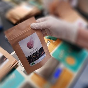 On colle les étiquettes, on remplit les sachets de thé, on les scelle : tout est préparé à la main, minutieusement, dans le respect de la certification bio.